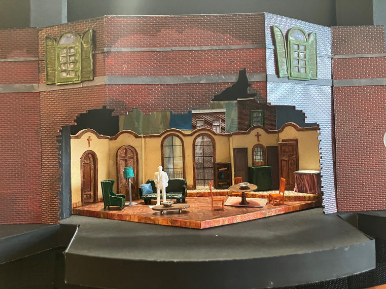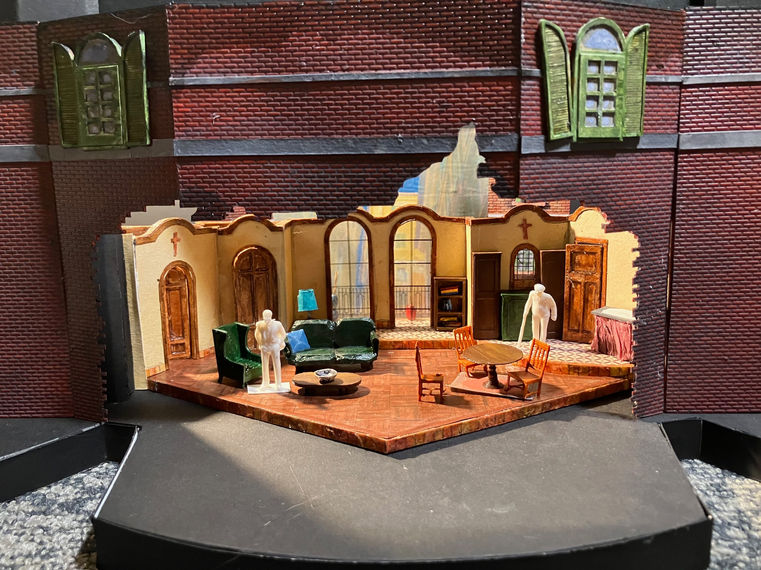 The play takes place in a middle class apartment where I created a place that at one time would have been warm and secure but now is filled with anxiety and uncertainty as the family tries to figure out what has happened to there loved one. I had the play space come through a broken wall of the apartment building as if the audience is forcing their way in, watching the family members. This is how family members feel, always watched by the actual government and how even their own home is no longer a safe space these families.
